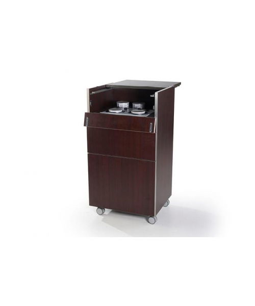Элегантная тележка, спроектированная для процедуры депиляции. Снабжена ванночкой для воска, ящичком для инструментов и съемной корзинкой – что делает рабочую среду более практичной для персонала.